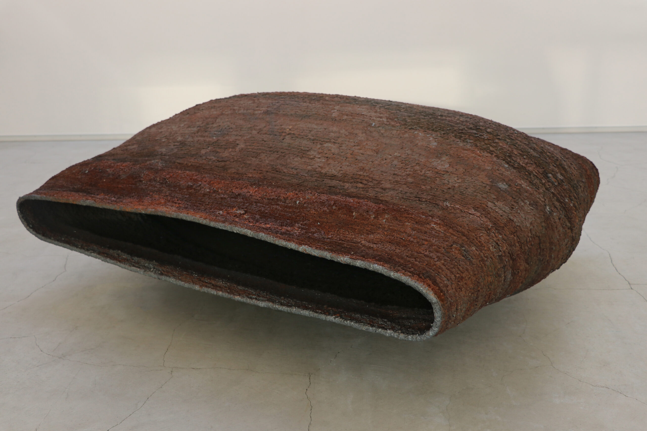 鏡面磨きされた鉄板は周囲の景色を鮮明に切り取りますが、空気や湿度に触れ続けることで徐々にその表面は錆びによって侵食されていきます。このようにして「管理された=切り取られた自然」が、鉄自体が持つ自然へ還ろうとする性質によって失われていく様は、人工物と自然の境界を曖昧にします。