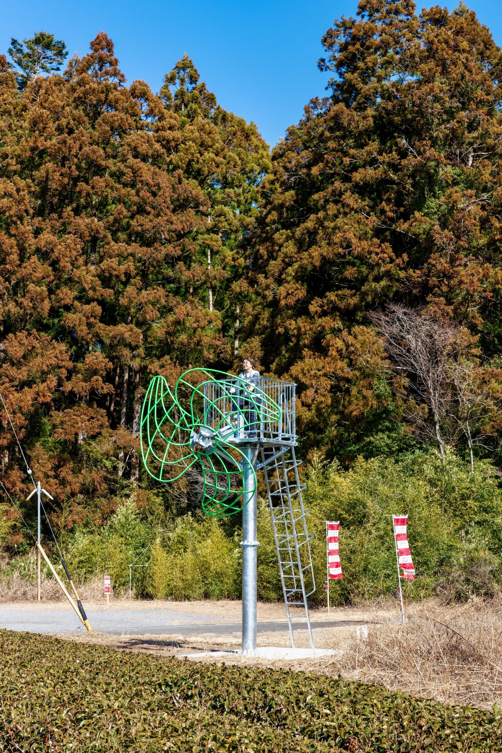 高速道路を降りて茶畑だらけの風景に一気に変わると、島田に入ったという実感が湧く。整えられた茶樹の独特な形状と、それを見守る防霜ファンが立ち並ぶ風景はとても美しい。作品を通じて地元の人々と訪れる人々の間での対話を促し、この美しい茶畑の風景をさらに愛してもらうきっかけとなればと思う。