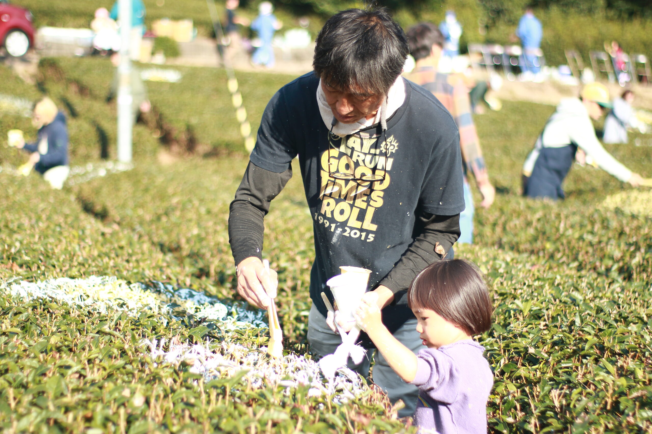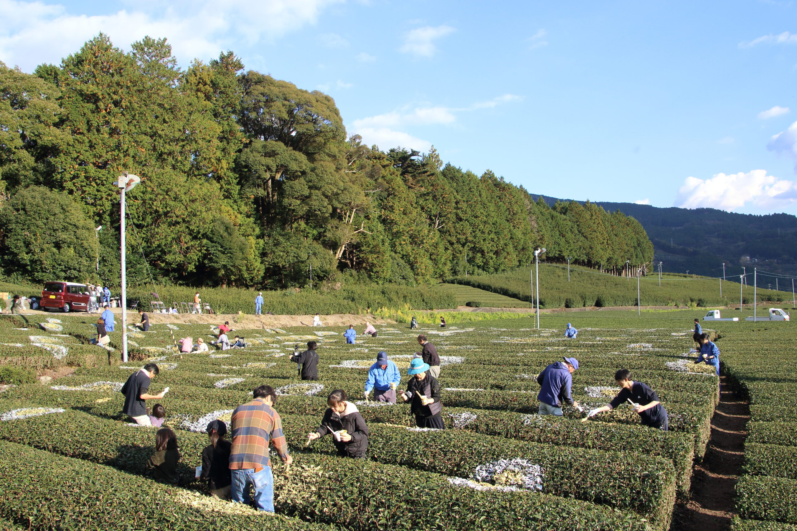 私たちは自身で見ている日々の景色を意識することもなく暮らしている。 収穫されなくなった茶畑が増えている。手入れをされなくなると茶畑はそこだけ森のようになり荒れていく。その森のような茶畑にみんなで「色」を咲かせ自分の手で風景を変える体験を2025年11月に約40名で開催